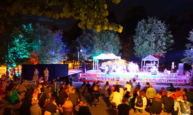 So auch dieses in 2021. Auf der Aktionsfläche gibt es bereits eine Bühne, aber für unseren erhöhten Technikbereich haben wir uns ein Podest gewünscht. Da sich unsere Logistik in den letzten zwei Jahren aber massiv entwickelt hat, und wir vor zwei Jahren wohl auch noch nicht an die Lauti-Aufbauten von heute geglaubt hätten, wollten wir das mal wagen: Vier Bühnenplatten für die Technik, eine kleine Menge für den Anfang. Und dann ergab es sich sogar sehr günstig: Mit dem LKW hätte man sie uns recht spät erst bringen können, und sie lagerten schon unweit vom Einsatzort auf der Inselbühne. Nur ein paar Meter durch die Stadt, und wenn etwas nicht klappt, kommt ein LKW als Backup.